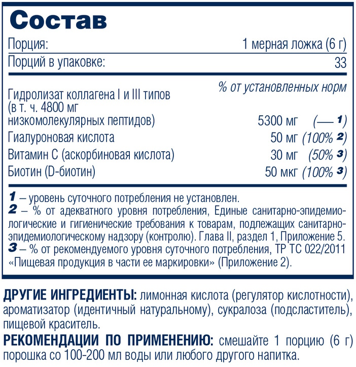 Данный комплекс содержит в составе коллаген, гиалуроновую кислоту и витамин С и является великолепной эффективной поддержкой для суставов, связочного аппарата и кожи. Входящие в добавку компоненты в совокупности оказывают более мощное действие, чем по отдельности. Коллаген помогает восстановлению соединительной ткани, повышает ее прочность, гиалуроновая кислота удерживает влагу в суставных тканях, коже и других органах, а витамин С улучшает усвоение этих компонентов, стимулирует синтез коллагена, а также поддерживает организм как мощный антиоксидант. В результате суставы меньше болят, быстрее восстанавливаются, улучшается их подвижность, кожа становится более упругой и гладкой, а волосы и ногти приобретают гладкость и блеск.