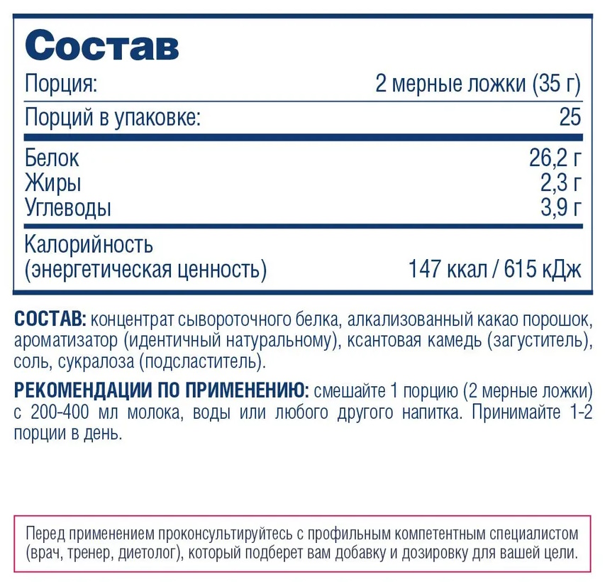 Это первый стопроцентно натуральный протеин! Его главное достоинство – минимум добавок. Кроме самого концентрата сывороточного белка он содержит только лецитин, улучшающий растворимость, минимальное количество ароматизатора и подсластителя. Белка в нашем протеине чуть более 76 %. Это выше, чем реальное содержание белка в аналогичных протеинах ведущих мировых производителей спортивного питания. Ведь они добавляют в свой протеин массу компонентов, улучшающих вкус. В результате протеин получается по вкусу как мороженое, но эффективность его падает. И для достижения требуемого эффекта его приходится употреблять больше.