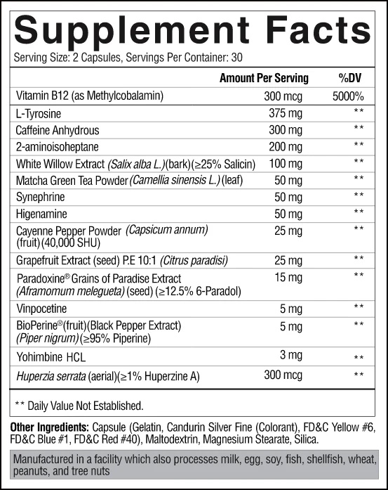 Основными компонентами Condemned Labz Arsyn являются кофеин, синефрин HCL, L-тирозин, Hordenine HCL, кора белой ивы, гидрохлорид 2-аминоизогептана (DMHA) и йохимбин HCL.