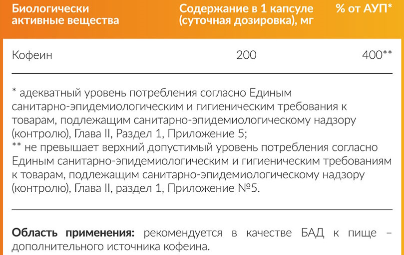 Рекомендуется принимать кофеин по одной капсуле не более 2 раз в день с перерывом между приемами не менее 2-3 часов. Caffeine 200mg содержит концентрированную дозу чистого кофеина, эквивалентную 2 чашкам свежесваренного кофе.
