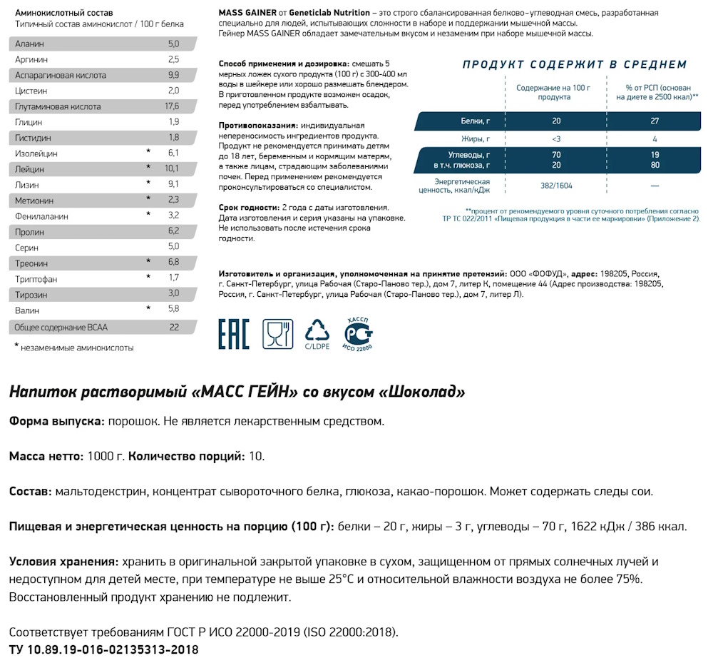 Высококалорийный гейнер Mass Gainer от Geneticlab предназначен для питания профессиональных спортсменов, а также для тех, кто набирает массу. Соотношение углеводов к белку в нем равно 3:1. С каждой порцией вы обеспечите потребность организма в 20 граммах белка и 72 граммах углеводов (в зависимости от выбранного вкуса данные показатели могут отличаться, см. на упаковке).