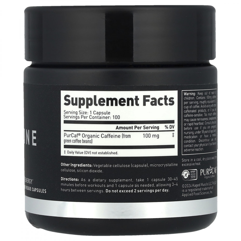 Kaged Muscle PurCaf Caffeine 100 – энергетическая добавка с 100 мг кофеина в 1 капсуле, что равно 2 чашкам эспрессо. Эффективна перед тренировкой, так как поднимает уровень адреналина в крови, позволяя тренироваться больше и упорнее.