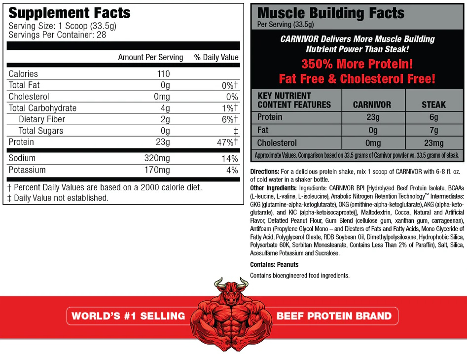Революционная формула биоинженерного изолята говяжьего протеина с беспрецедентным содержанием аминокислот в сравнении с другими белками, получаемыми из молока, яиц и сои. Их концентрация достигает 350 процентного превышения обычной нормы филейного стейка. Carnivor Isolate является мощным анаболическим средством для ускорения прироста мышечной массы. Основной помощник в этом — эксклюзивная технология ANRT, которая обеспечивает вторичное использование аминокислот в формировании мышечных волокон, а также исключает накопление токсинов, тем самым защищая мышцы от вредного воздействия аммиака.