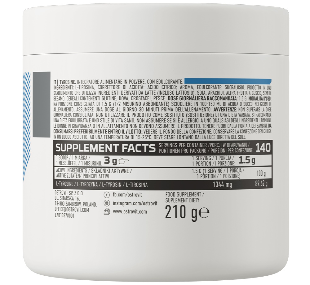 OstroVit Tyrosine является спортивной пищевой добавкой, которая служит источником высококачественного L-тирозина. L-тирозин — аминокислота, которая входит в состав белков тканей. L-тирозин является прекурсором нейромедиаторов — дофамина и норэпинефрина, а также гормонов надпочечников — адреналина и норадреналина. Эти элементы необходимы для правильного функционирования мышечных клеток и эмоциональных процессов в организме. Продукт на основе L-тирозина идеально подходит для устранения утомления, увеличения выносливости, уменьшения жира, повышения концентрации, улучшения настроения.