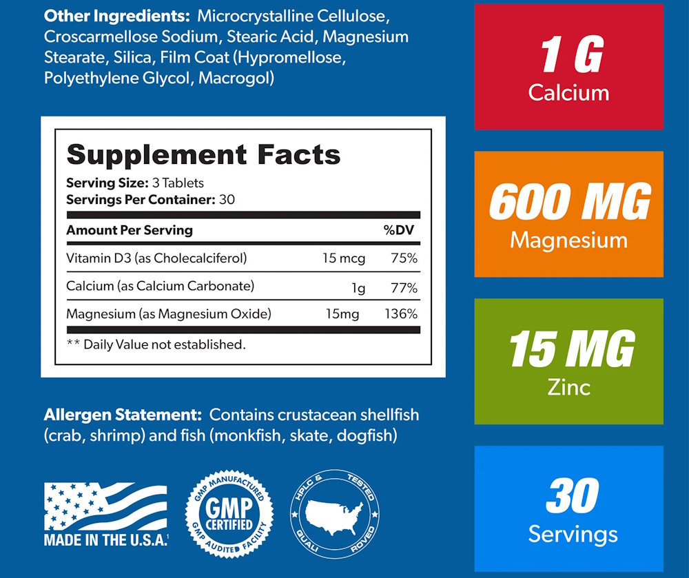 Кальций и магний поддерживают крепкие здоровые кости, а также помогают нервным, мышечным и метаболическим функциям. Магний также играет важную роль в формировании белка и здоровой функции мышц. Цинк способствует нормальному синтезу белка и образованию коллагена, регулируя тем самым сокращение мышц.