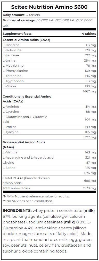 Scitec Nutrition Amino 5600 (200 таб.) — сверхэффективная формула аминокислотной добавки для питания мышц в период интенсивных тренировок. «Скайтек Нутришн» предлагает полный набор аминокислот способных стать мощным толчком в достижении самых невероятных целей. За получение желаемого результата в наращивании мышечной массы отвечает хорошо подобранные ингредиенты, такие как молочные белки (гидролизованные сывороточный протеин и казеина натрия), аминокислоты ВСАА и L-глютамин в свободной форме.