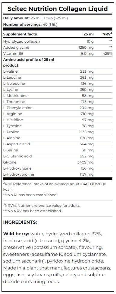 Scitec Nutrition Collagen Liquid 1000 мл — необходимая добавка, предотвращающая травмы костной системы при тяжелых нагрузках. Состоит из гидролизованного коллагена, который является основным белком для строительства костей, связок и хрящей. В период интенсивных тренировок важно поддерживать костную систему и суставы в рабочем состоянии способных выдержать большие перегрузки. Для этого необходимо купить Collagen Liquid, его жидкая форма, обогащённая витамином B6, пополнит организм, необходимым запасом структурного протеина (коллагена), обеспечив прочную связь клеток соединительной ткани.