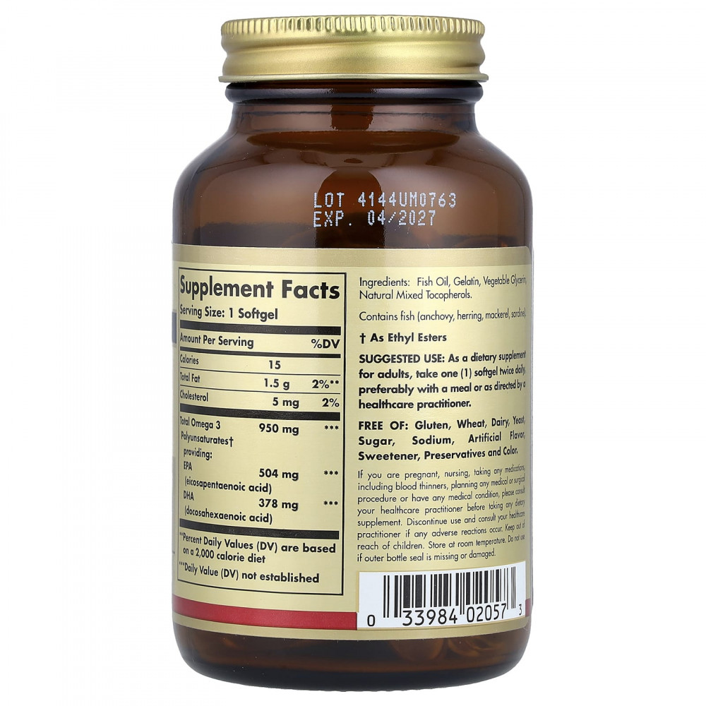 Солгар Тройная Омега-3 ЭПК/ДГК, 950 мг показан при заболеваниях сосудов сердца, гиперлипопротеинемии (диабет, гипертензия, избыточный вес, атеросклероз), экземе, псориазе, других заболеваниях кожи.