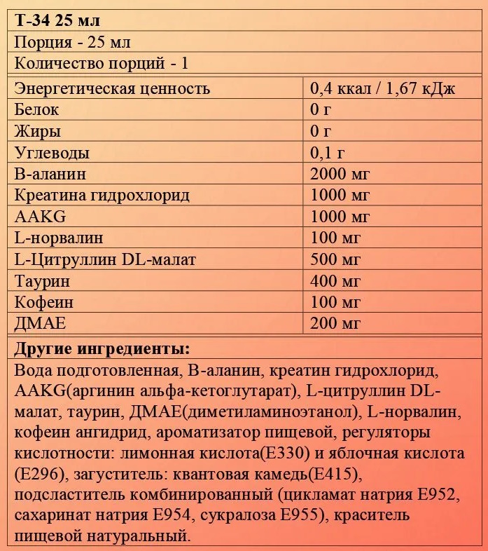SportLine T-34 shots имеет уникальную особенность не только повышать настроение на занятие в зале, накачку на каждой тренировке благодаря содержанию в составе мощных компонентов: B – аланин, Креатин гидрохлорид, L-аргинин, Тирозин, Цитруллин, Таурин, Кофеин, Витамин С, 1,3 ДМАА.
