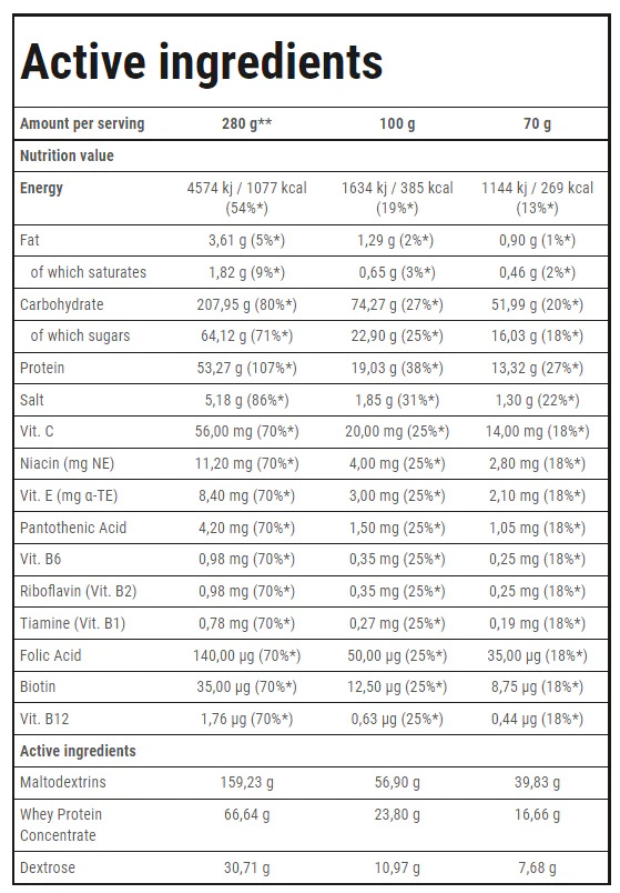 MASS XXL обеспечивает равномерную энергетизацию и поставку углеводов и аминокислот, необходимых для мышечной регенерации. Продукт обогащен комплексом витаминов, способствующих метаболизму белков и углеводов в организме.