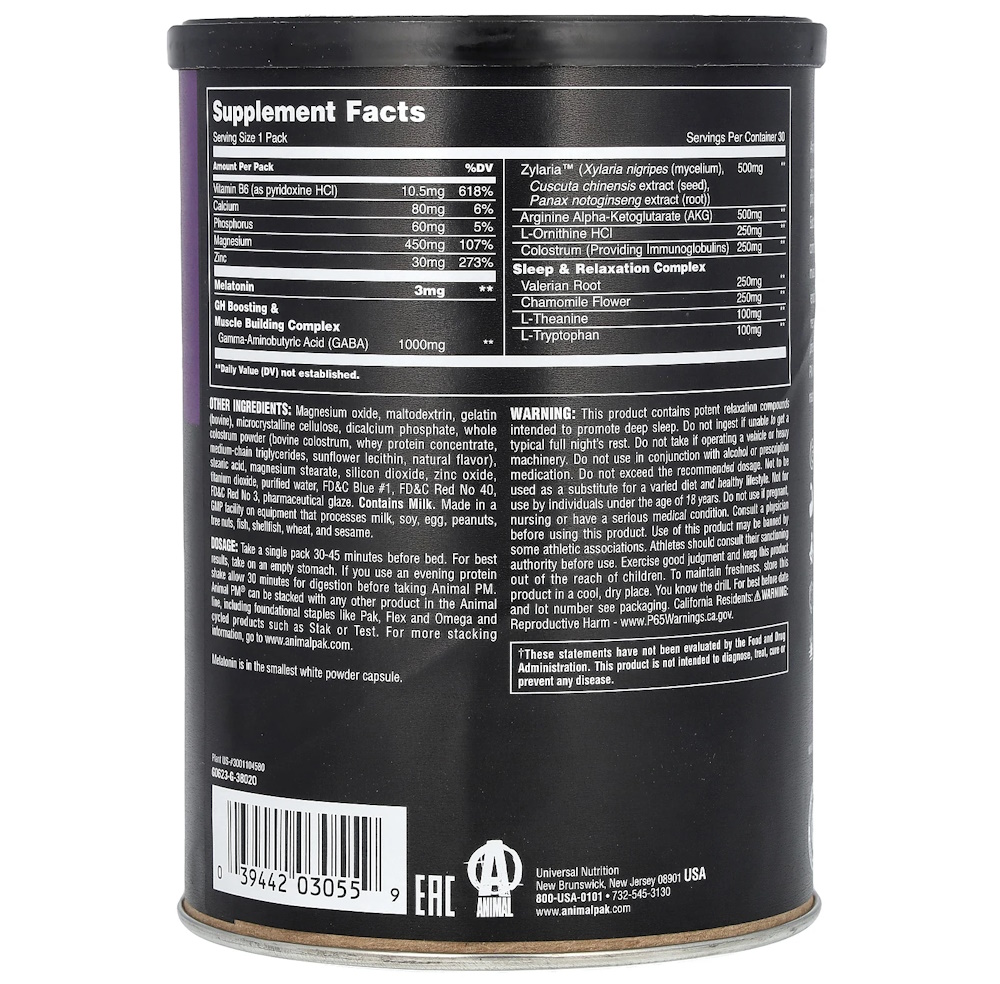 Universal Nutrition Animal PM является уникальным анаболическим продуктом, который разработан, чтобы помочь Вам отдохнуть и восстановить силы. В состав Universal Nutrition Animal PM входят продукты, улучшающие сон, повышающие иммунитет, а также незаменимые аминокислоты и запатентованные компоненты для восстановления организма. Корень валерианы и ромашка - растения, которые были использованы на протяжении веков для достижения эффекта релаксации, снижения чувства тревоги и борьбы с бессонницей. L-тианин – аминокислота, содержащаяся в зеленом чае и известная своей способностью снижать напряжение и беспокойство, а также улучшать качество сна. Хмель традиционно используется при лечении нервных расстройств, помогая уменьшить тревогу и улучшить качество сна. Комплекс стимулирования гормона роста, а также важнейшие аминокислоты, как аргинин, орнитин, триптофан, L-глютамин играют важную роль в обеспечении иммунологических процессов, снижении риска инфекционных заболеваний, в процессе синтеза белка. Запатентованный комплекс Immunolin ® является изолятом иммуноглобулина и естественным образом защищает от болезней и инфекций. Уникальный компонент Humanofort TM - экстракт олигопептида - содержит природный фактор роста и способствует повышению уровня тестостерона, улучшению либидо, повышению уровня адреналина, снижению уровня кортизола, ускоряет процесс восстановления.