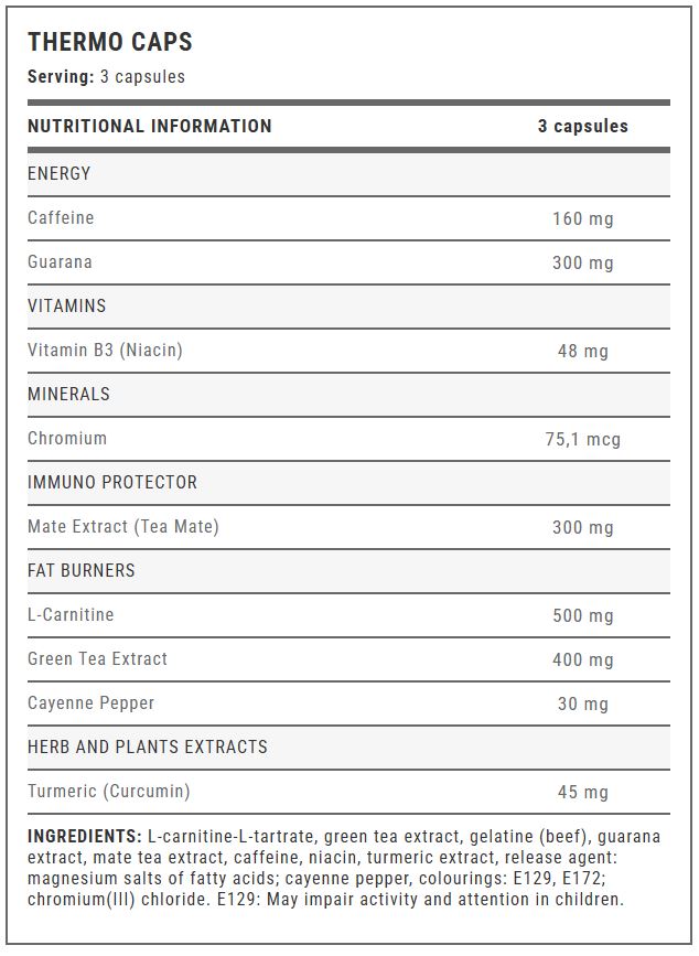 Weider Thermo Caps обеспечивает двойной эффект – трансформация жира в чистейшую энергию и формирование на этой базе четкого рельефа мускулатуры. Продукт содержит в своей формуле традиционный Л-карнитин, который известен своей супер-способностью моментально активизировать процессы сжигания жировых резервов. Состав Weider Thermo Caps клинически доказал свою супер-эффективность и включает: